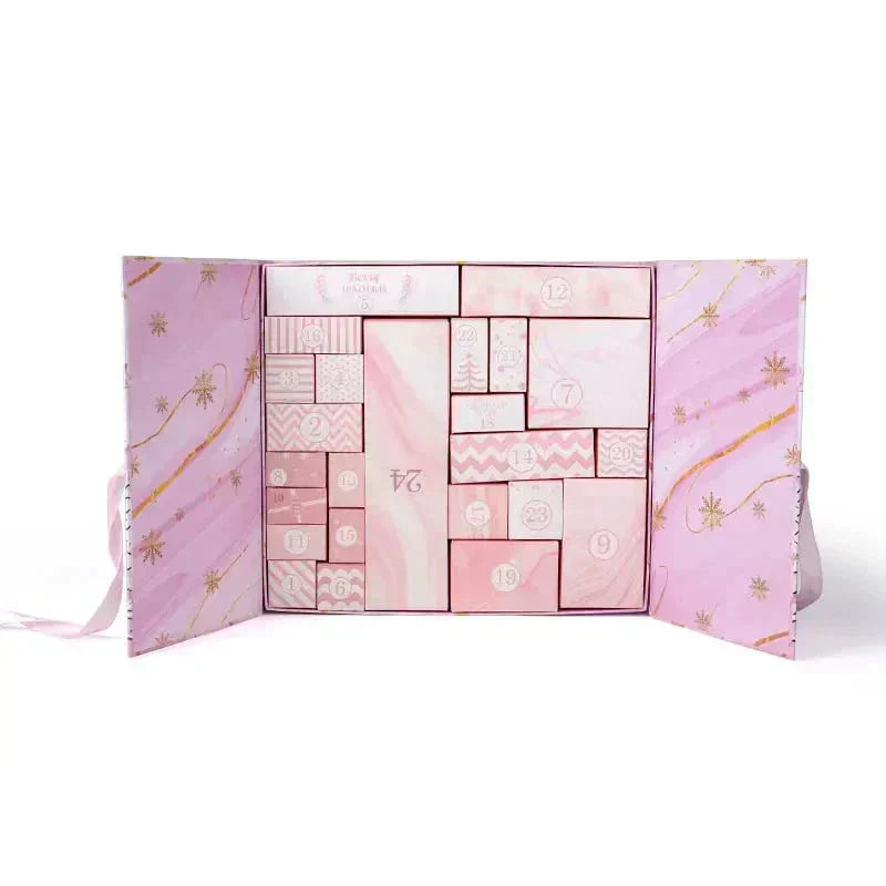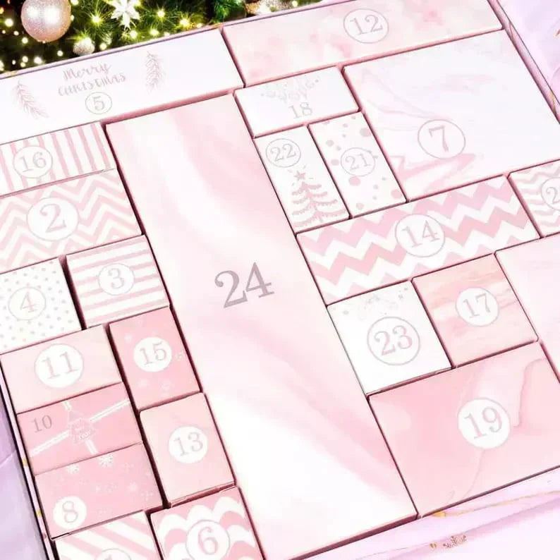 Този елегантен розов адвентен календар съдържа 24 номерирани кутийки за всеки ден от декември, предлагайки вълшебни усещания с всеки отворен подарък.