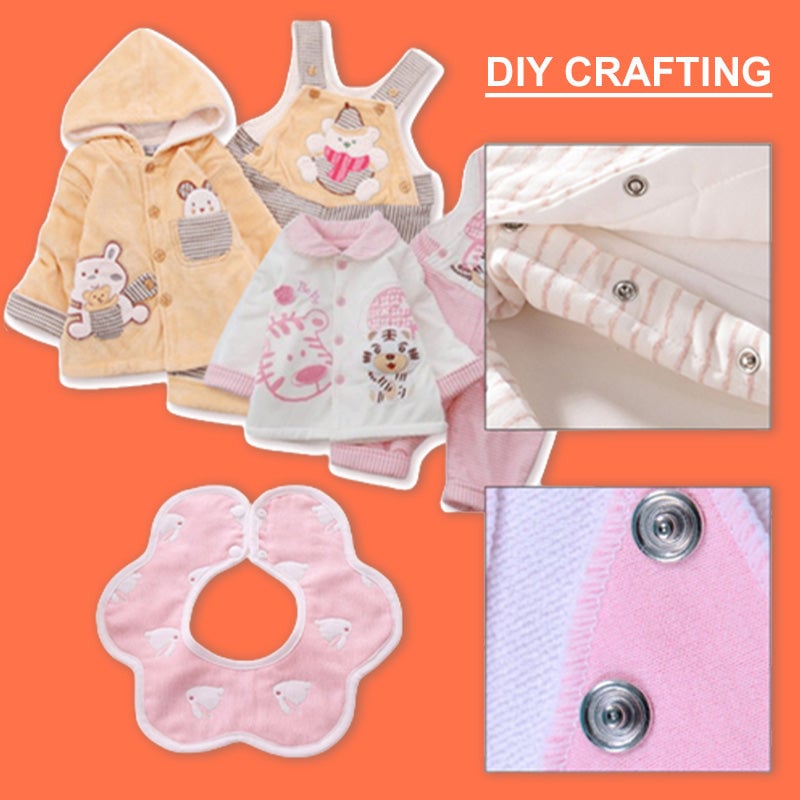 Този набор от инструменти за пресоване на шпилки е достатъчен, за да отговори на различните ви нужди за изработка на дрехи. Той може да се прилага за бебешки лигавници за пълзене, шапки, ризи, бебешки гащеризони, кърпи за слюнка, дрехи за барби/кукли, дрехи за домашни любимци или други места, където имате нужда от него.