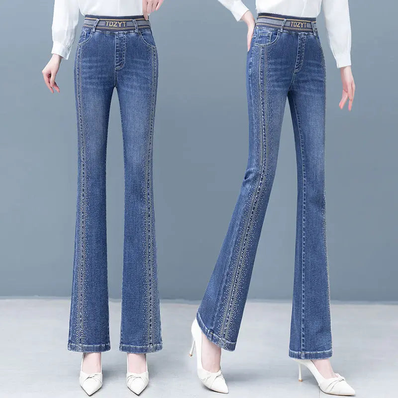 Дамските еластични дънки с висока талия и камбанка са стилен и вдъхновен от ретро стил избор за тези, които ценят класическия, но модерен външен вид. Тези дънки са проектирани така, че да прилягат към тялото и да подчертават извивките, като същевременно предлагат комфорт и гъвкавост.