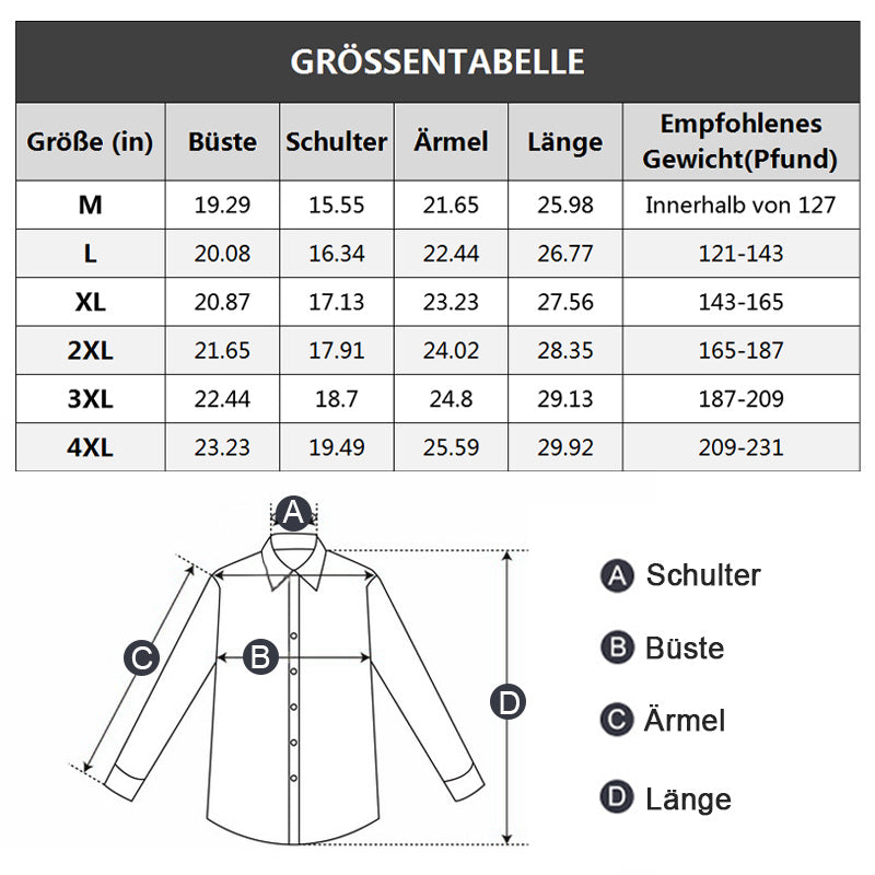 | 3XL | 74 | 29.2 | 58 | 22.5 | 48 | 18.7 | 63 | 24.8 | 180-200 |